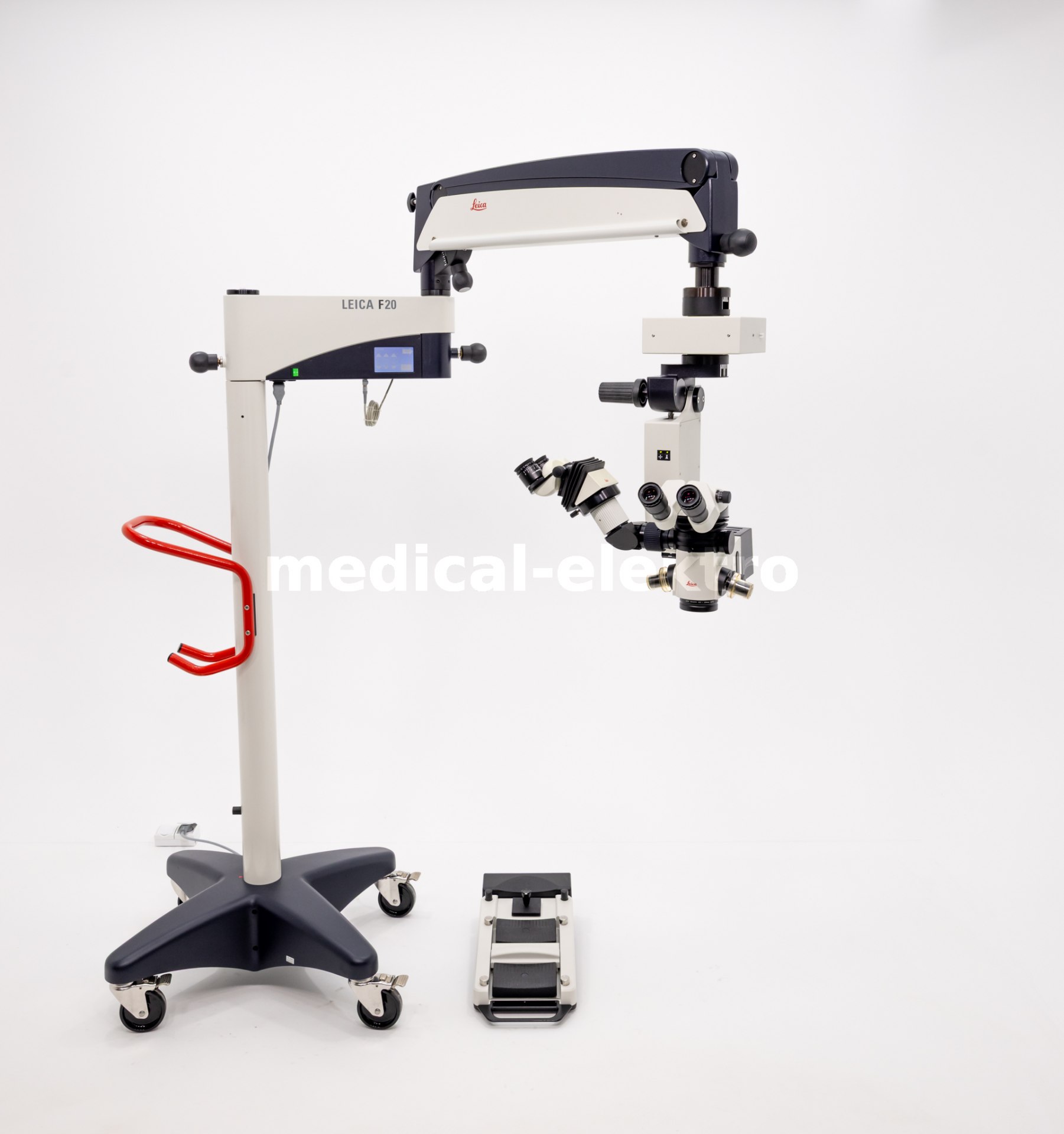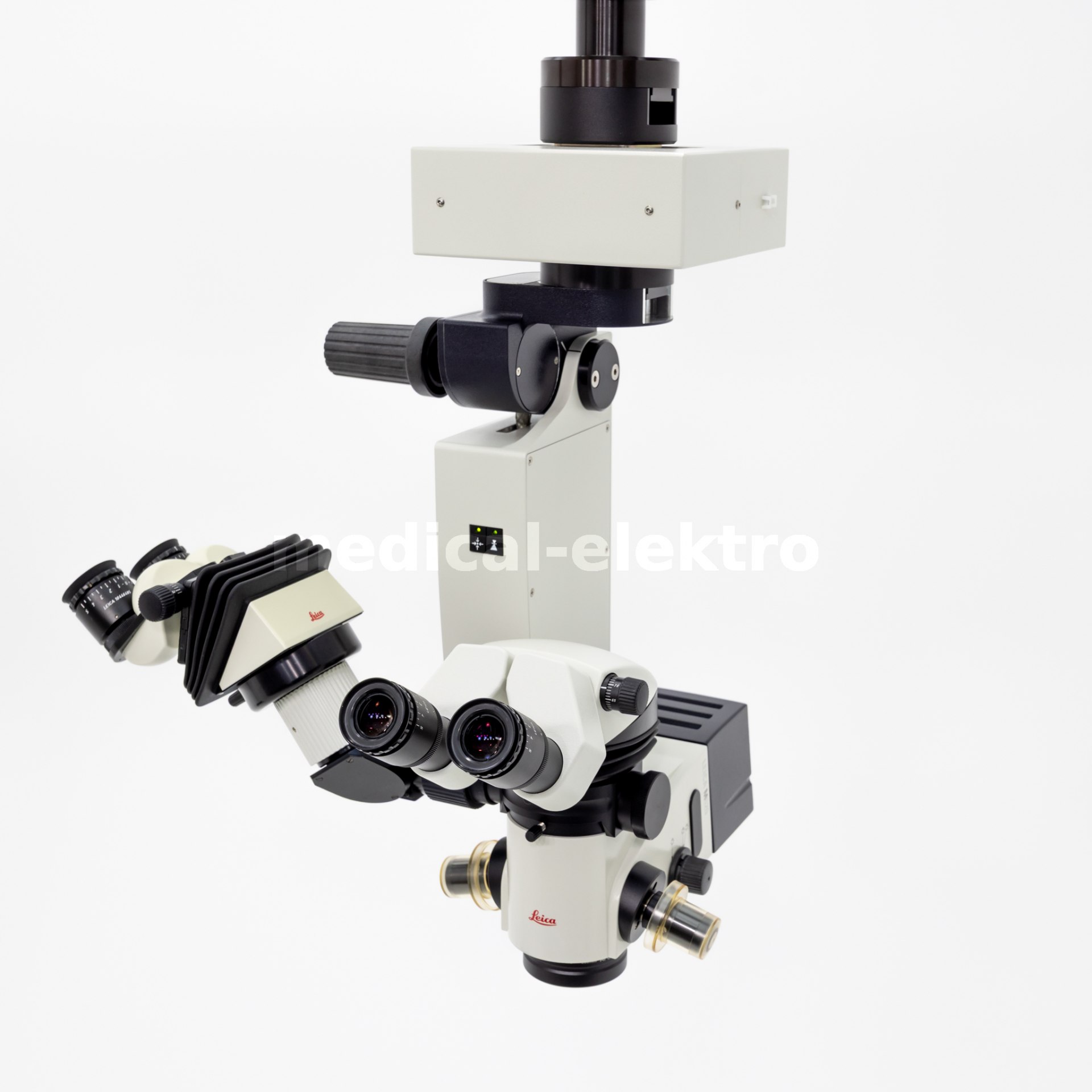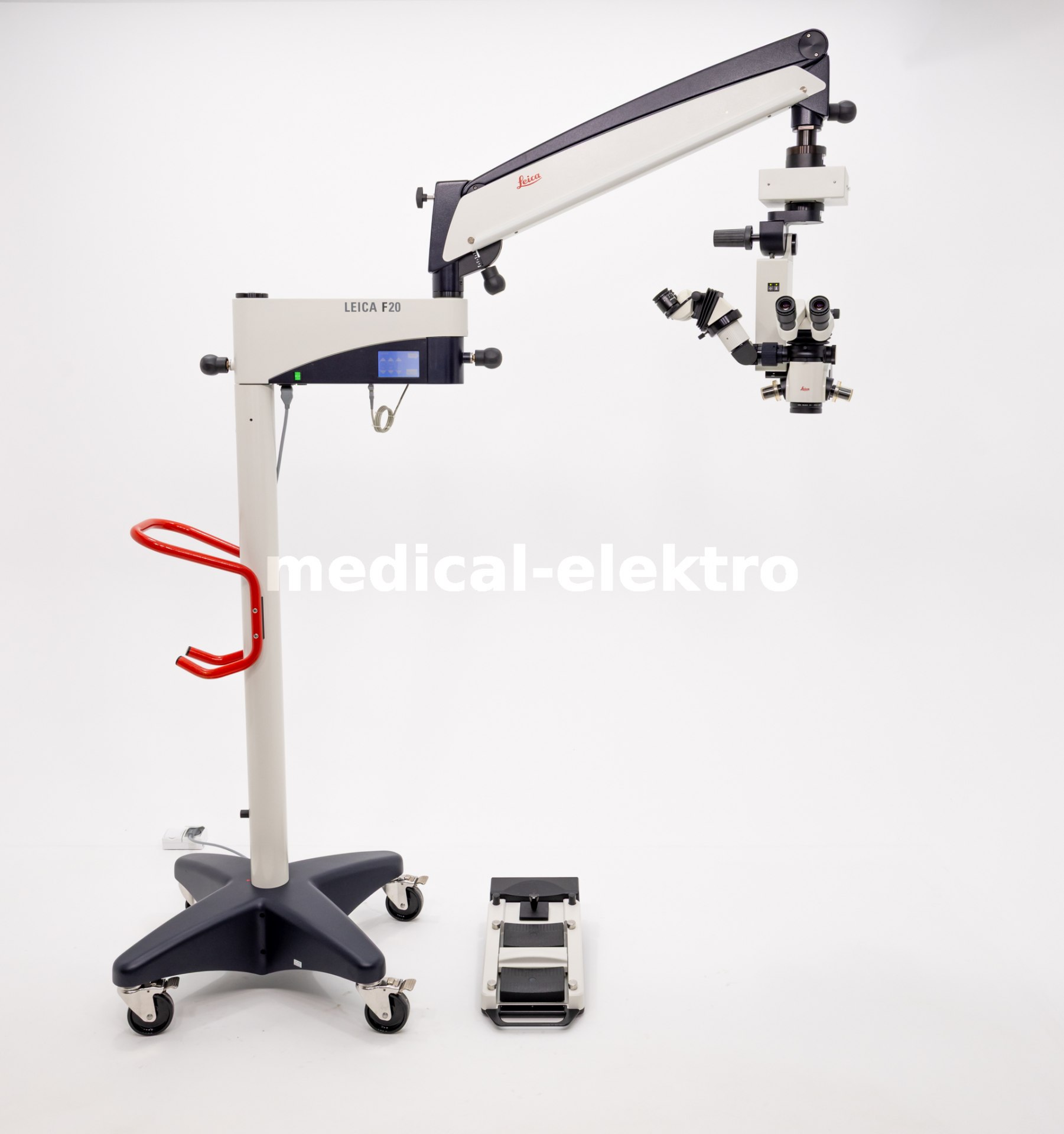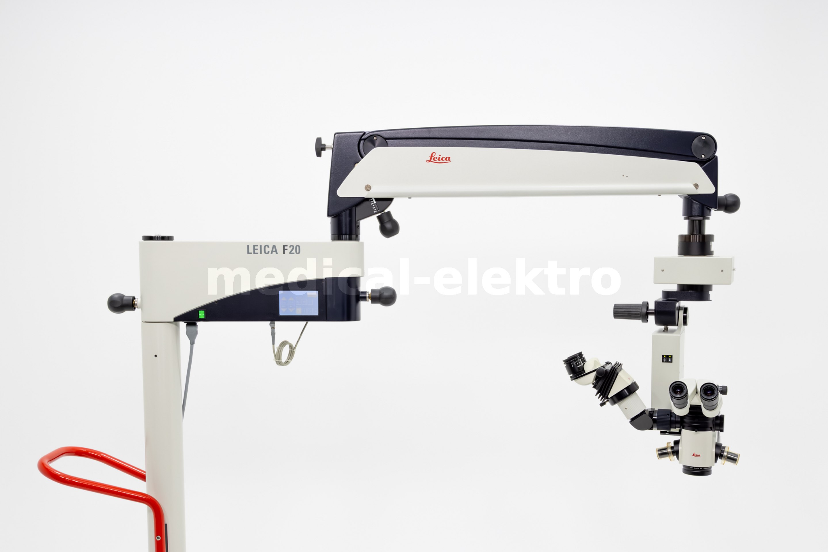 Ein gebrauchtes, überholtes, elektrisch gesteuertes Operationsmikroskop Leica M620 auf einem F20 Bodenstativ. Das Mikroskop ist ideal geeignet für die Ophthamologie.