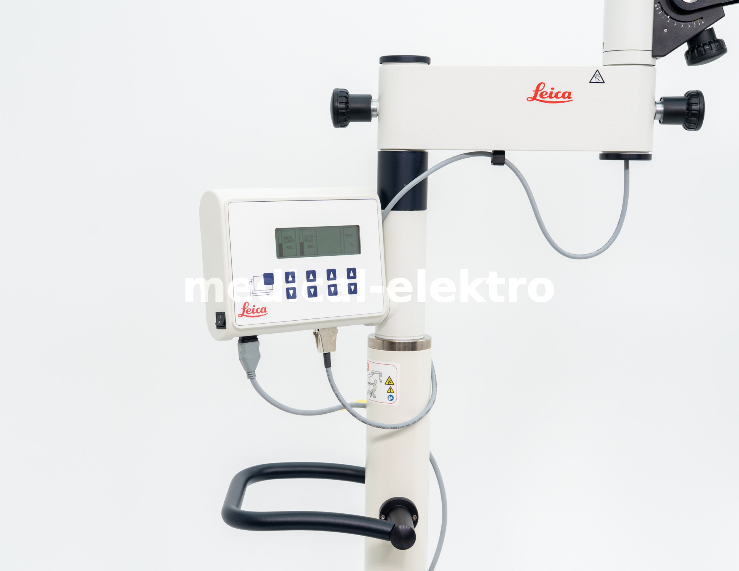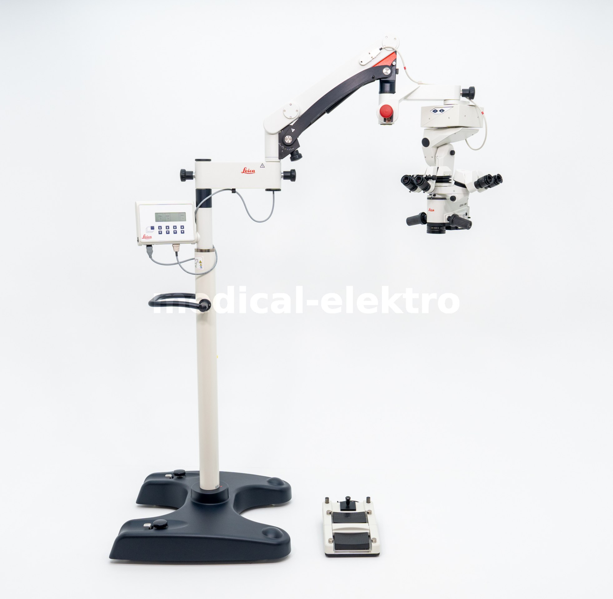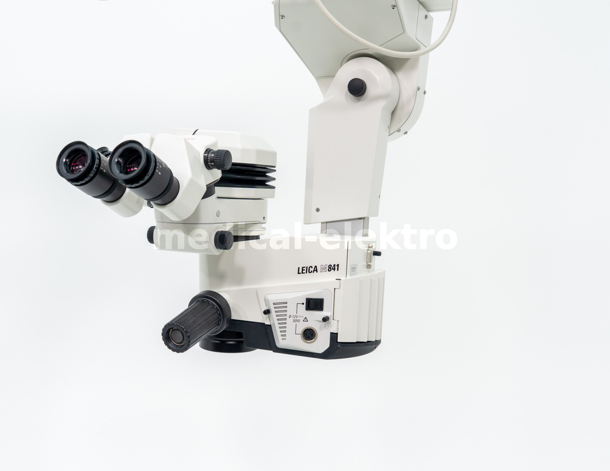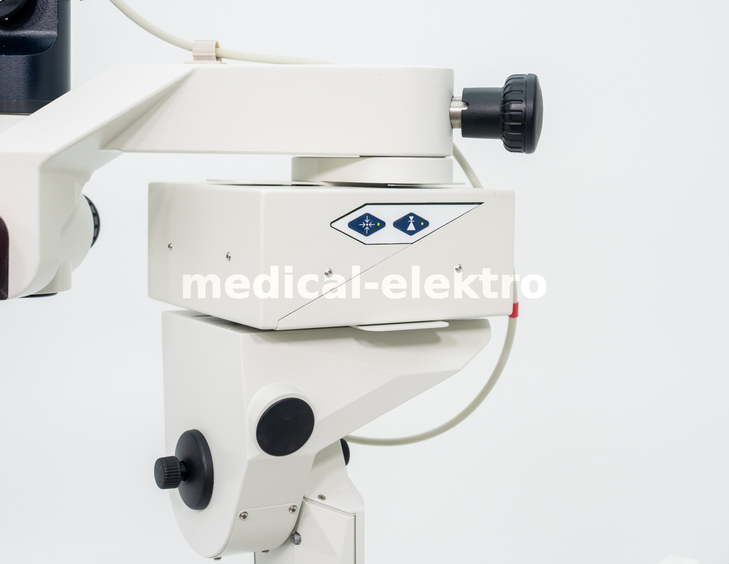 Ein gebrauchtes, überholtes, elektrisch gesteuertes OP-Mikroskop Leica M841 auf einem Bodenstativ. Das Mikroskop ist ideal geeignet für Ophthalmologie.
