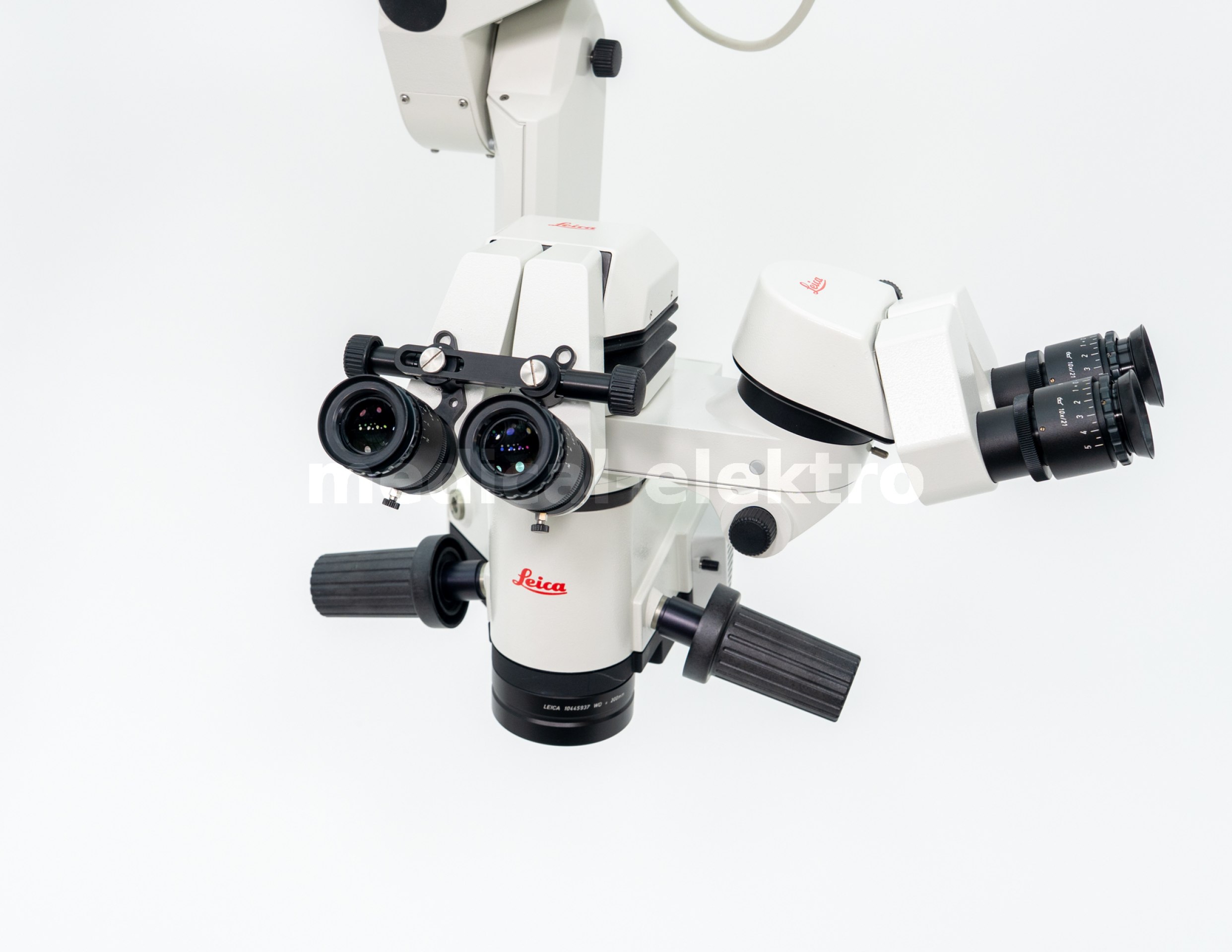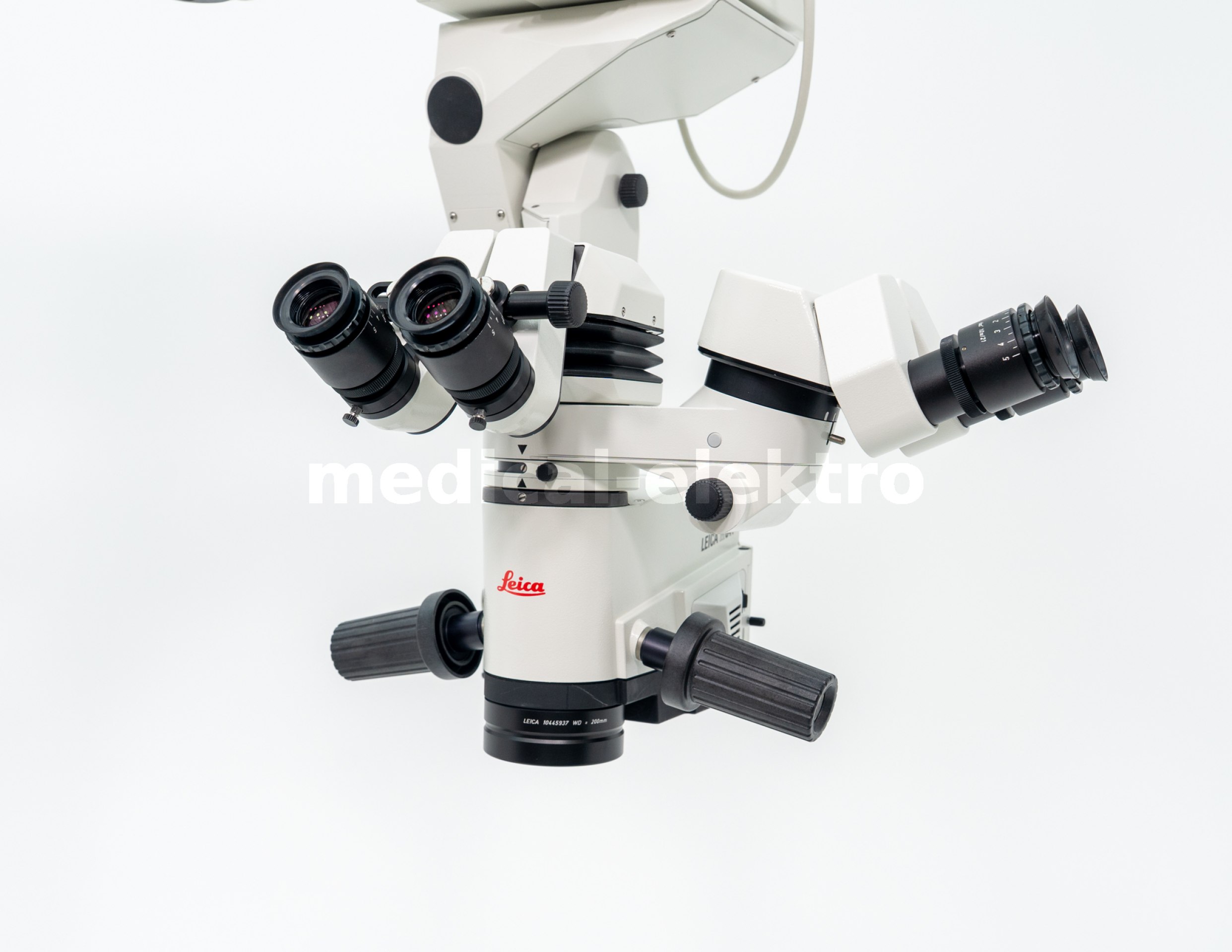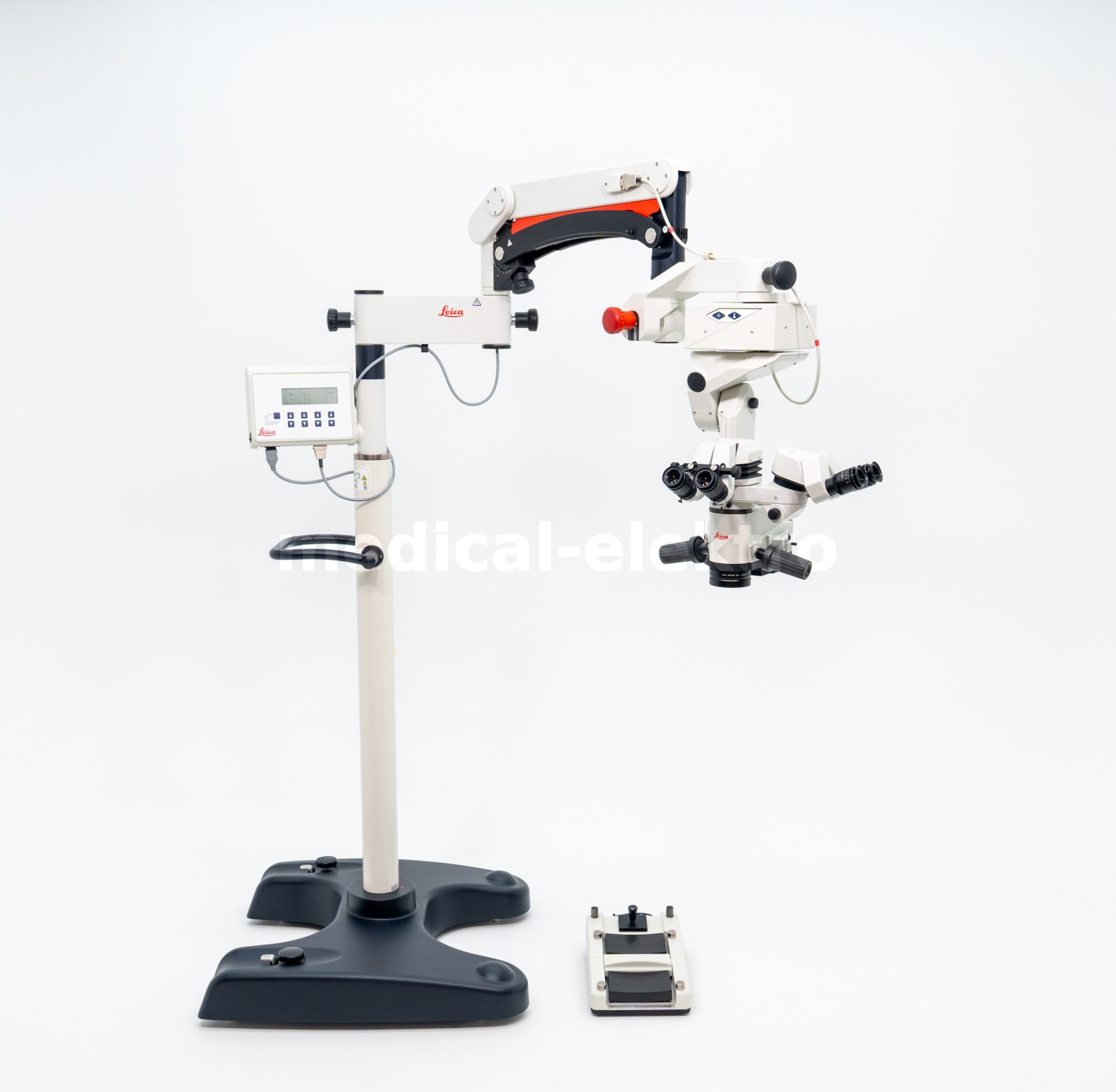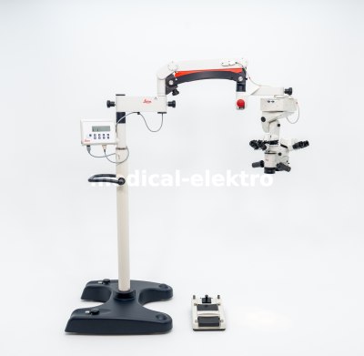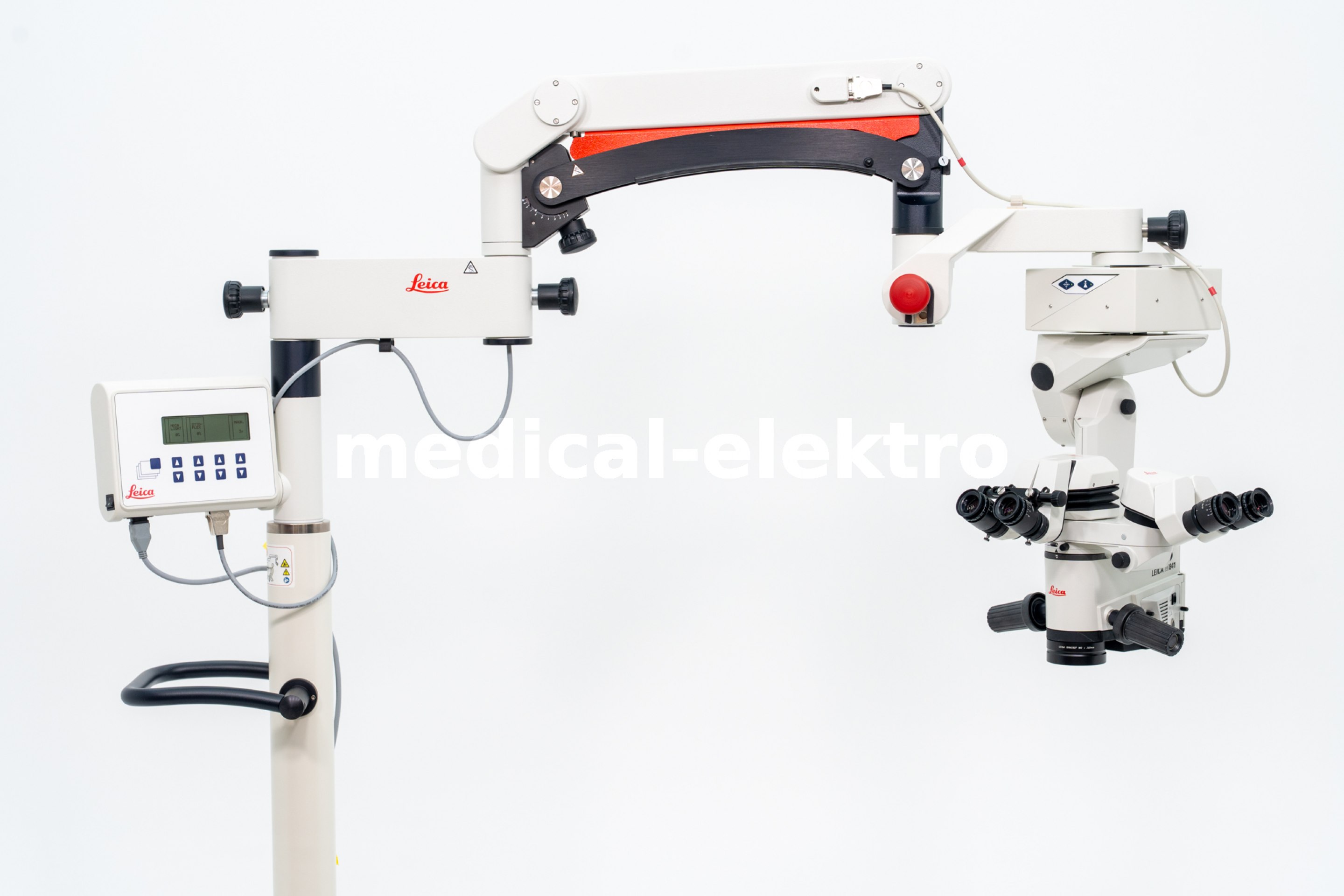 Ein gebrauchtes, überholtes, elektrisch gesteuertes OP-Mikroskop Leica M841 auf einem Bodenstativ. Das Mikroskop ist ideal geeignet für Ophthalmologie.