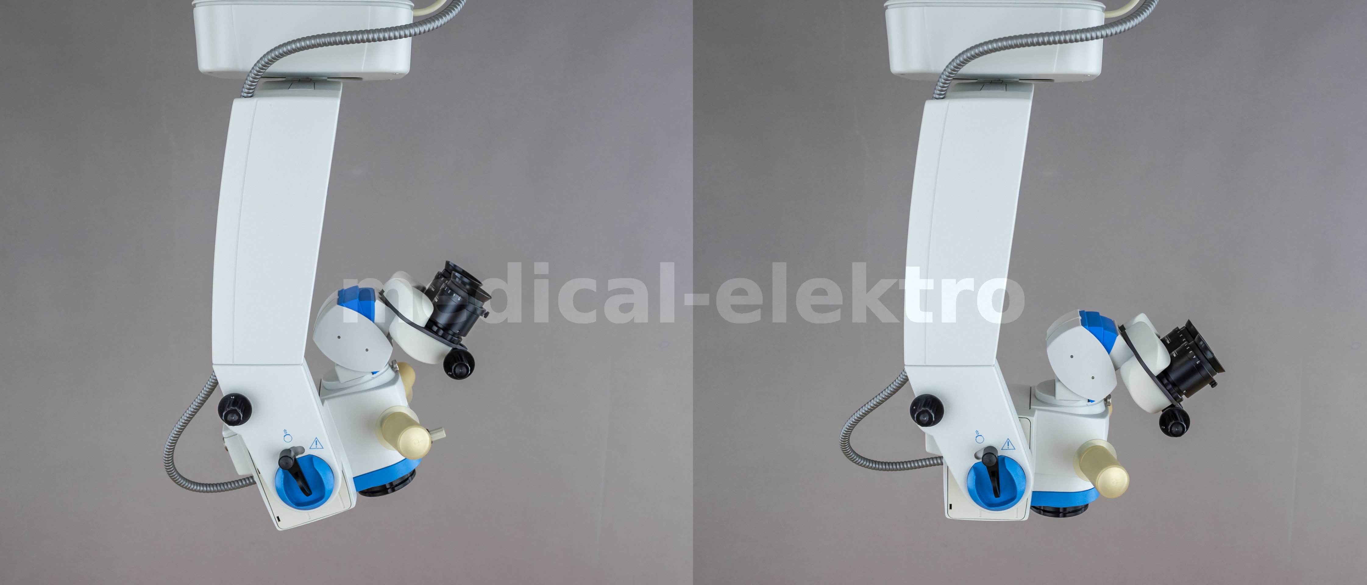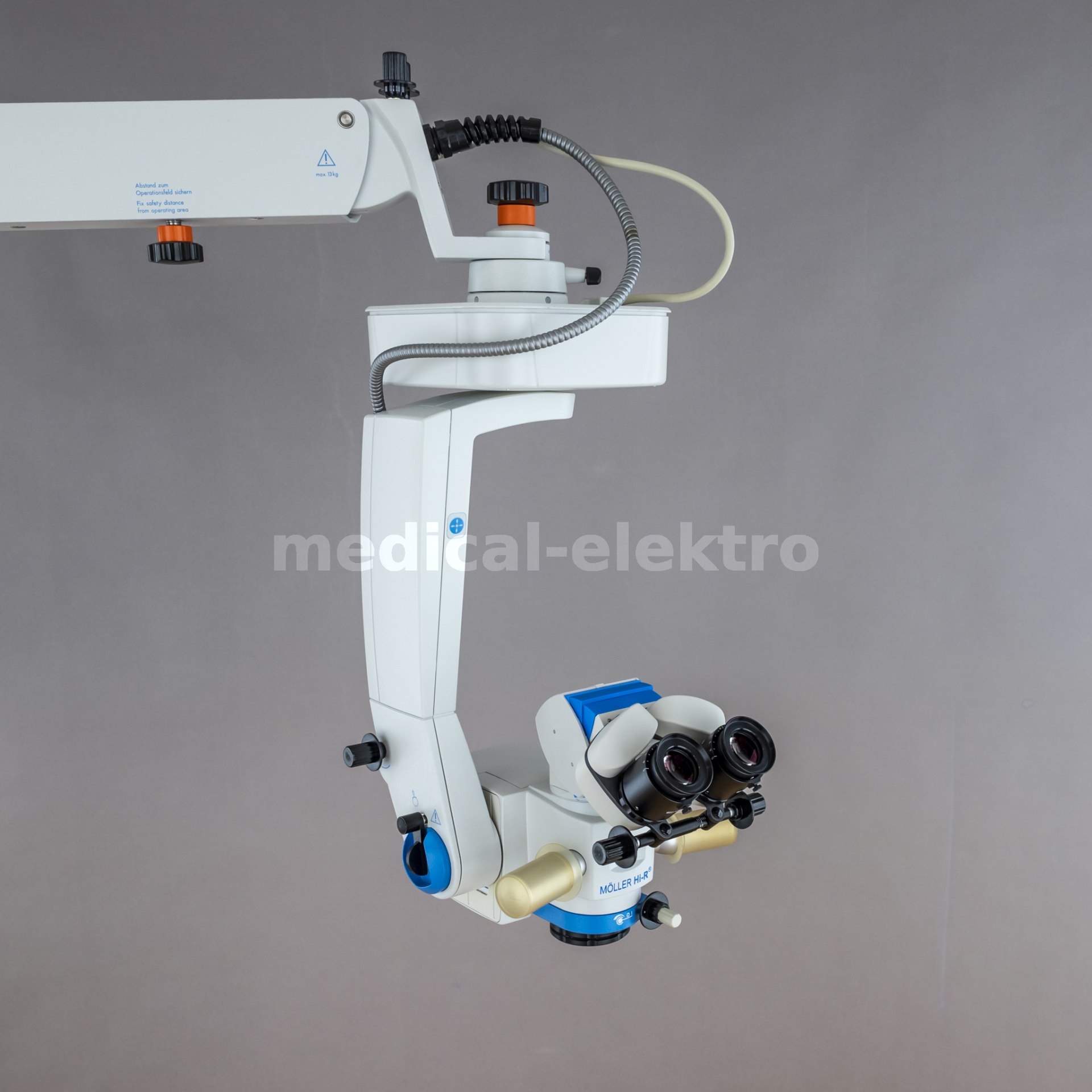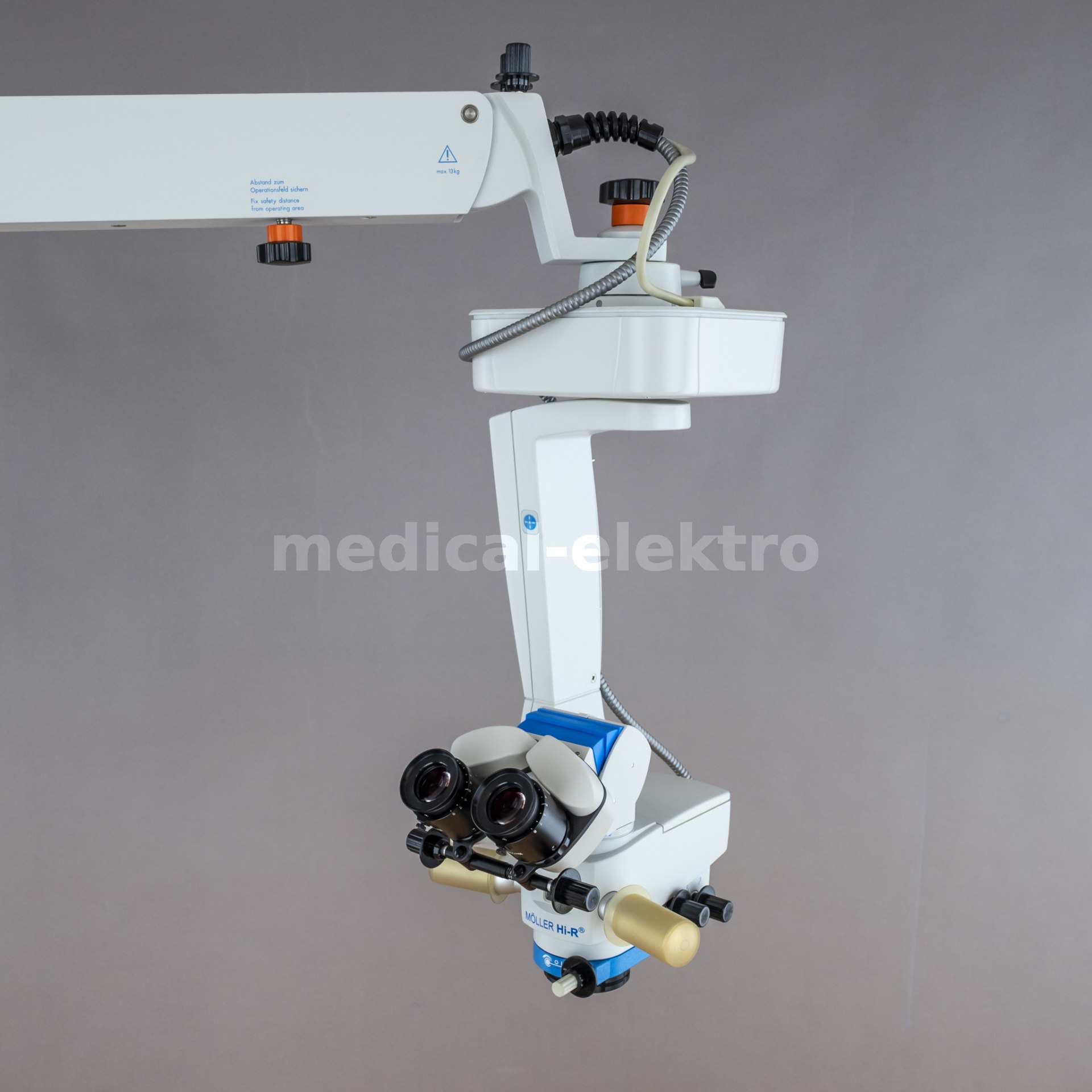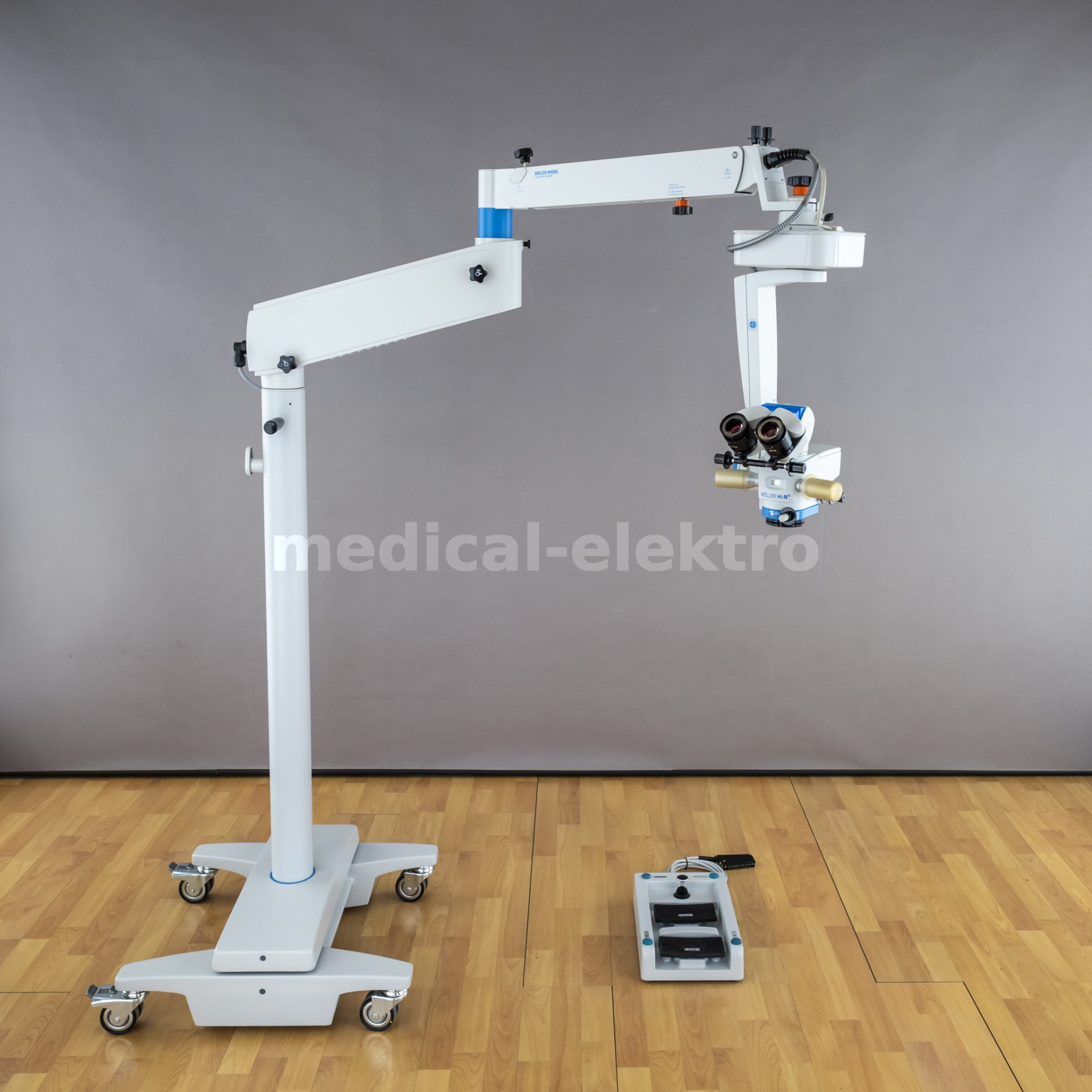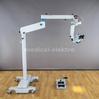 Used, refurbished, electrically controlled surgical ophthamology microscope Möller-Wedel Hi-R 900 on a FS 2011 floor stand.